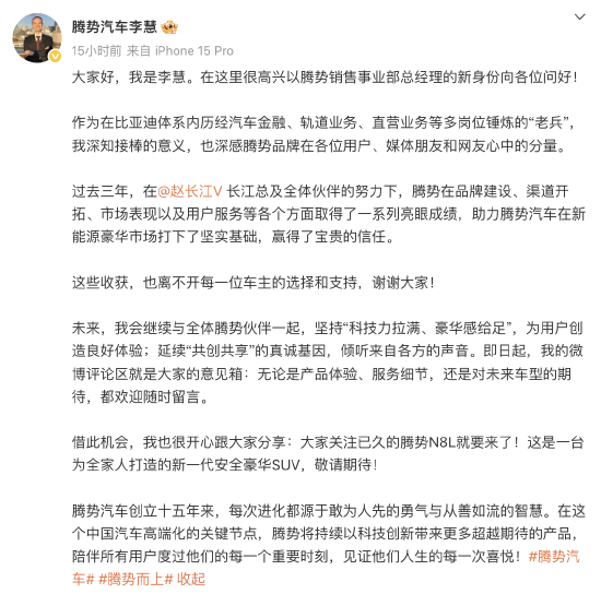 排名第一的炒股杠杆平台 比亚迪李慧上任腾势总经理后首发长文,预热腾势N8L
